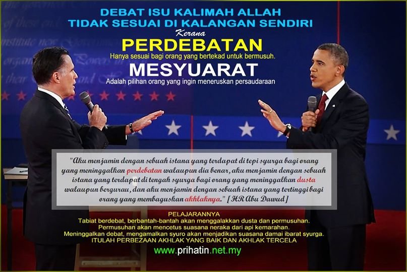 Tidak pasti jenis mentaliti umat bagaimanakah kita ini. Apabila direncanakan saranan agar kita meninggalkan debat, kelihatan terlalu ramai yang membantah. Debat ada disebut dalam quran kata mereka. Ya memang ada disebut, malah BANYAK SEKALI ALLAH sebut dan telah kami muatkan sebahagiannya, tetapi itu bukan untuk kita mengamalkannya, sebagaimana Allah menyebut panjang lebar tentang saranan kaedah SYURO…!