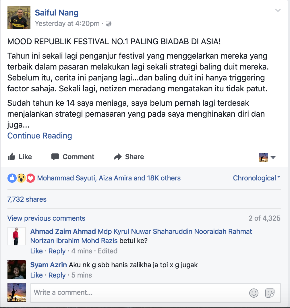 Tahun ini sekali lagi penganjur festival yang menggelarkan mereka yang terbaik dalam pasaran melakukan lagi sekali strategi baling duit mereka. Sebelum itu, cerita ini panjang lagi…dan baling duit ini hanya triggering factor sahaja. Sekali lagi, netizen meradang mengatakan itu tidak patut.