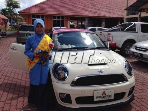 Siti Nur Fatini Zulaika di hadapan kereta Mini Cooper yang dihadiahkan bapanya.