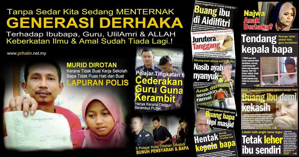 Kata orang tua, istilah lain bagi derhaka ialah “Anak kurang Ajar!!”. Memang sebenarnya kurang ajaran secara mendidik walaupun cukup pandai dalam akademik. Tablet diberi untuk anak berkeliaran di alam maya mencari keseronokan yang kebanyakannya berunsurkan lagho dan maksiat. Jangan hanya ingat maksiat itu sekadar anak menonton pornografi sahaja. Membuang masa bermain permainan internet juga satu bibit kemusnahan yang membawa kepada maksiat-maksiat lebih besar. Saudara mara datang pun mereka tidak peduli untuk menyapa dan bersuai kenal. Dipanggil buat tak tahu kerana leka. Menolong ibubapa jauh sekali.