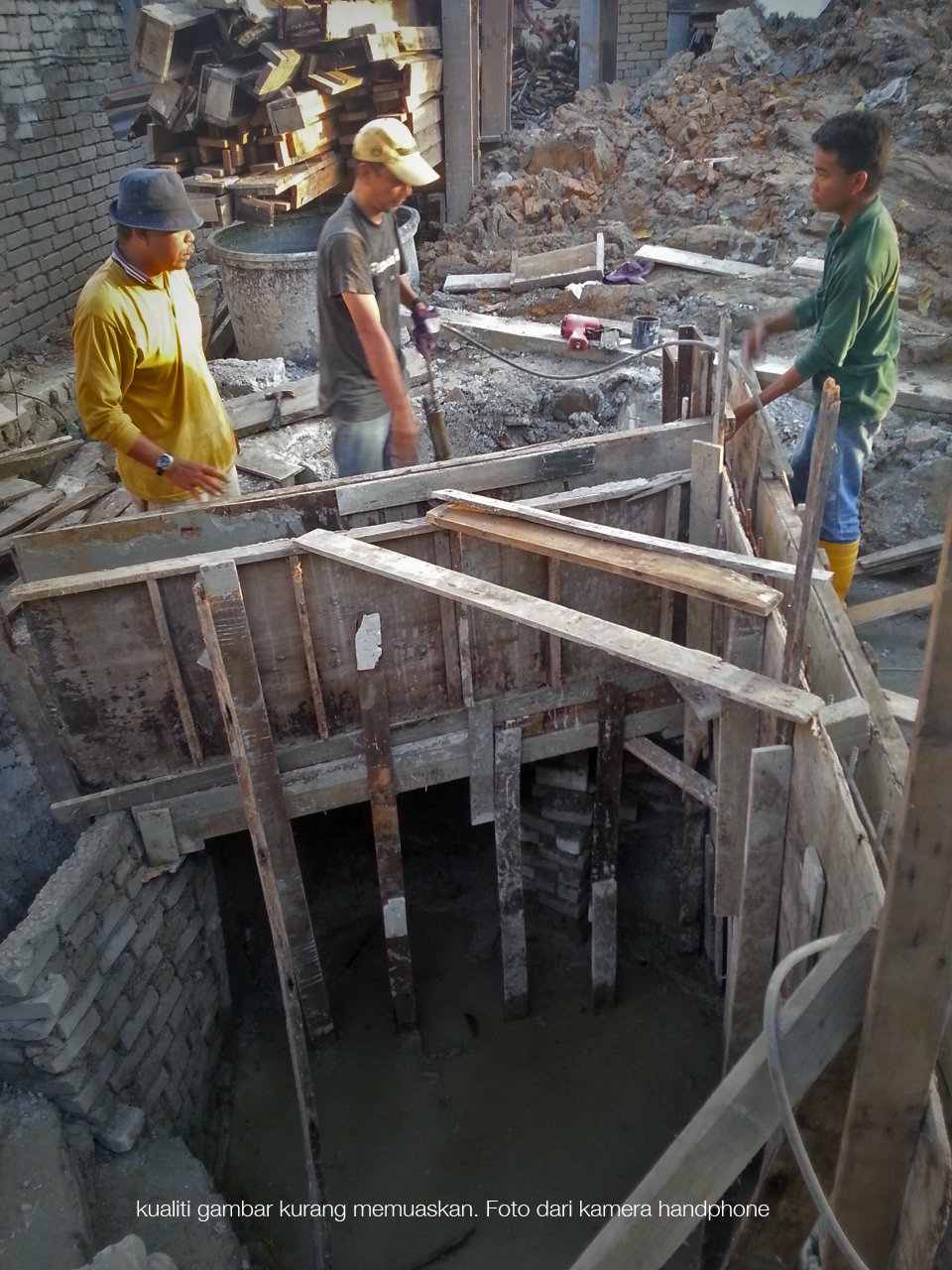 Di dalam foto di atas ini, Afiq sedang mendengar dengan teliti kepada makluman yang disampaikan oleh Ayah Yazid (bapa kepada Syafaat) dan Ayah Hatta / Baharuddin (bapa kepada Afiq) semasa dalam proses menyiapkan kolam tadahan air sedalam 13 kaki di RPWP.